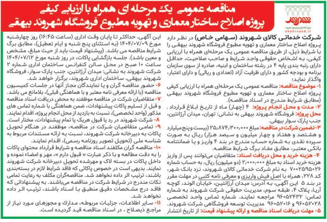 آگهی مناقصه عمومی يك‌مرحله‌ای پروژه اصلاح ساختار معماری و تهويه مطبوع فروشگاه شهروند بيهقی